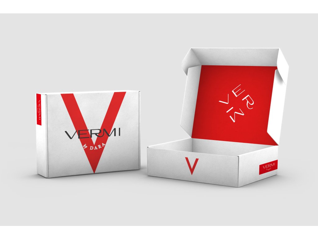 Originální dárková krabice, bílé barvy s výrazným logem VERMI by DARA na přední vnější straně a bílým monogramem na červené vnitřní straně víka.