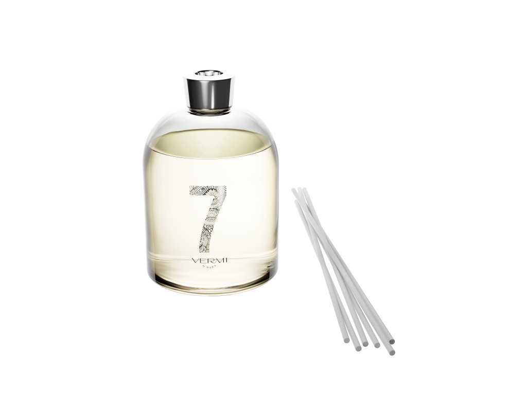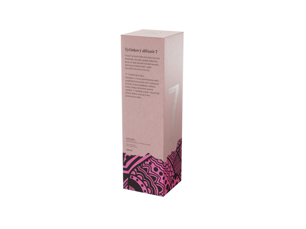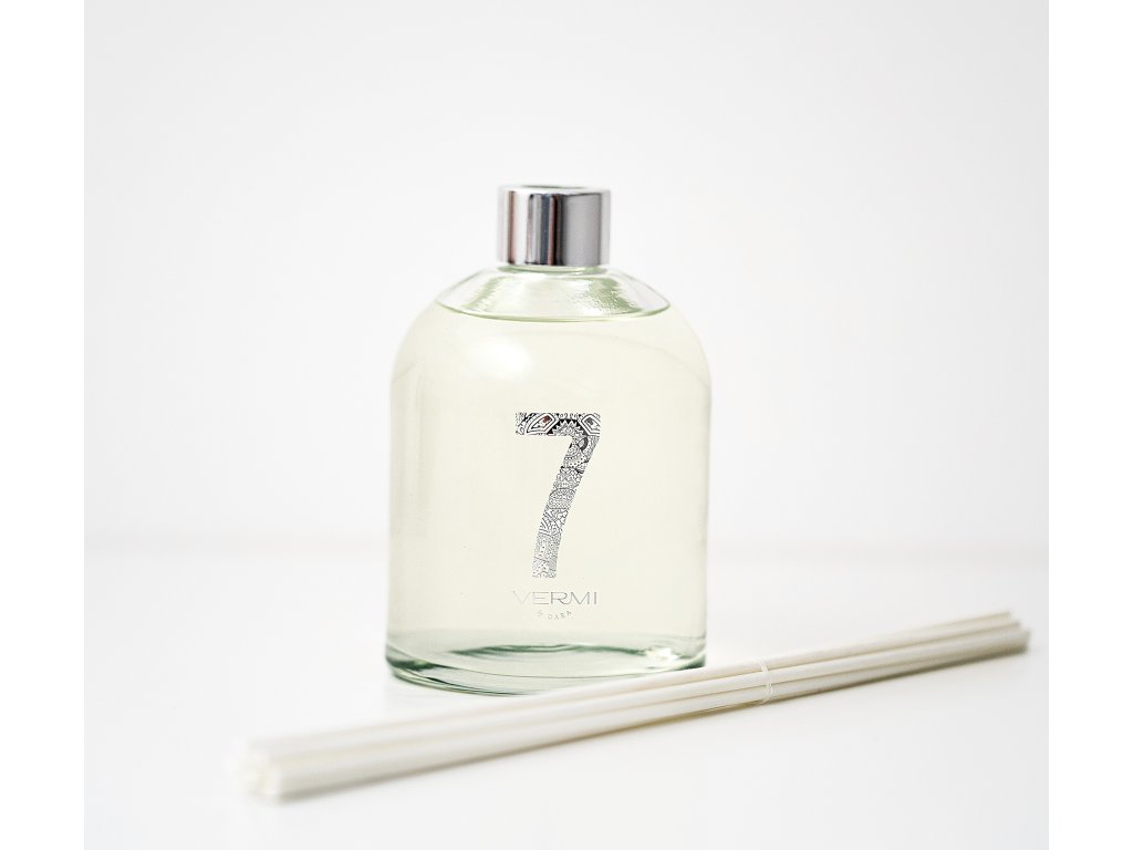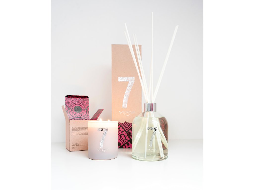 I když tento difuzér není v pořadí sedmý, tak jako tomu je u svíček VERMI by DARA, název 7 nese podle stejnojmenné vůně poslední uvedené svíčky a stává se proto nerozlučným společníkem trojice produktů, které DARA nazvala podle svého šťastného čísla, pod kterým se také narodila.