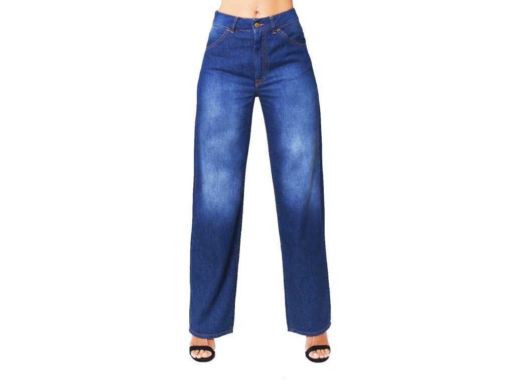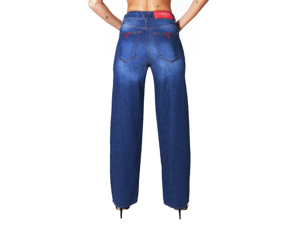 Inspirovány 90. lety, džíny s vysokým pasem a rovnými nohavicemi, zapínáním na jeden knoflík a zip. Originální červená výšivka ve tvaru „V“ na zadních kapsách. Lehce sepraný a broušený vzhled.