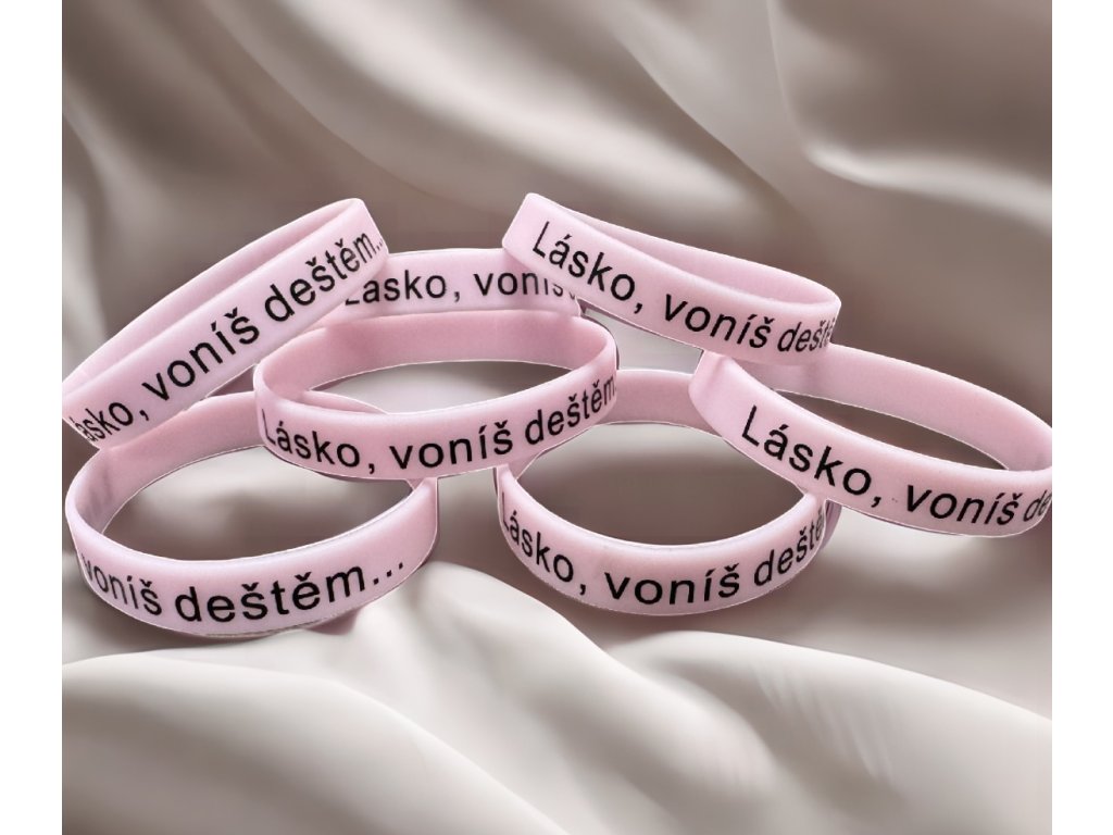 FLUORESCENČNÍ silikonový náramek v růžové barvě s černým nápisem "LÁSKO, VONÍŠ DEŠTĚM".