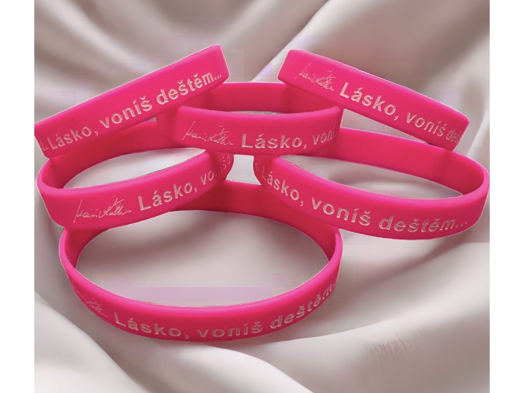 Silikonový náramek v růžové barvě s nápisem "LÁSKO, VONÍŠ DEŠTĚM".