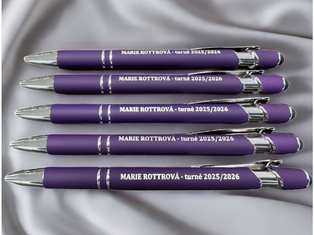 Propisovací tužka v nachové barvě s bílým nápisem "MARIE ROTTROVÁ - TURNÉ 2025/2026".