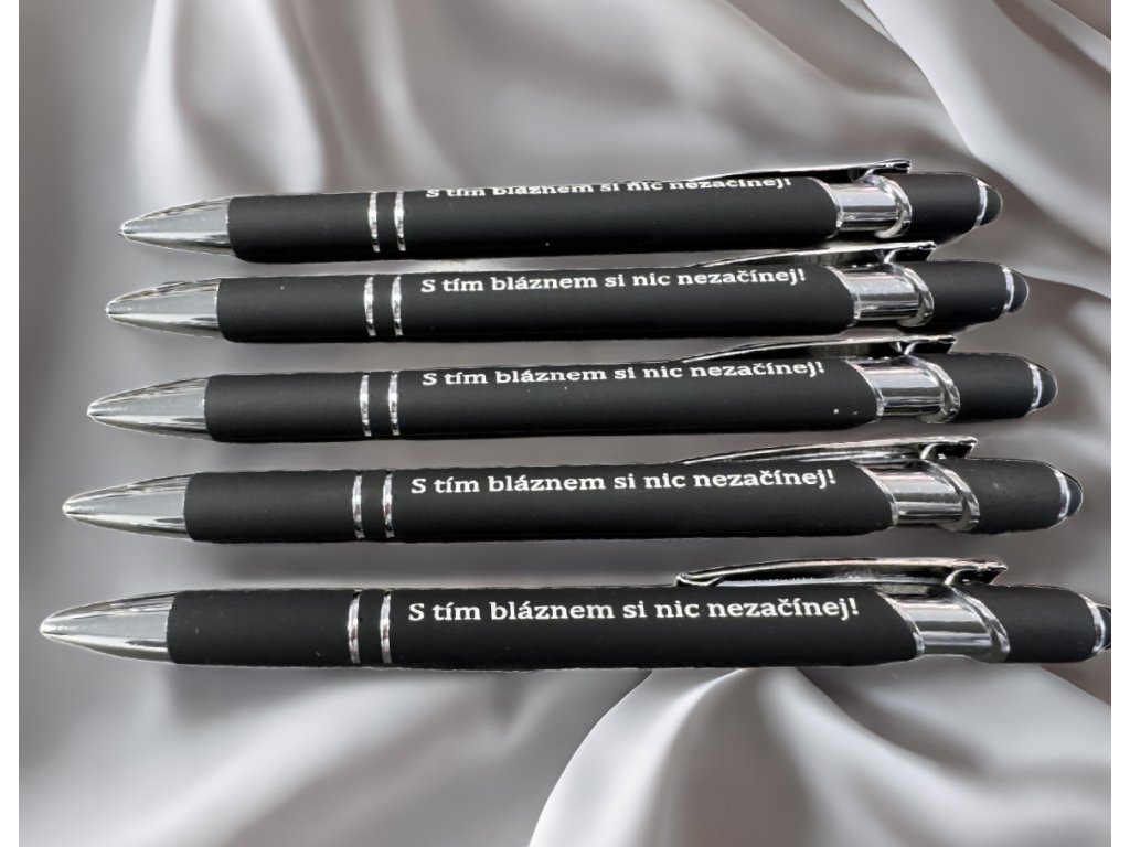 Propisovací tužka v černé barvě s bílým nápisem "S TÍM BLÁZNEM SI NIC NEZAČÍNEJ!".