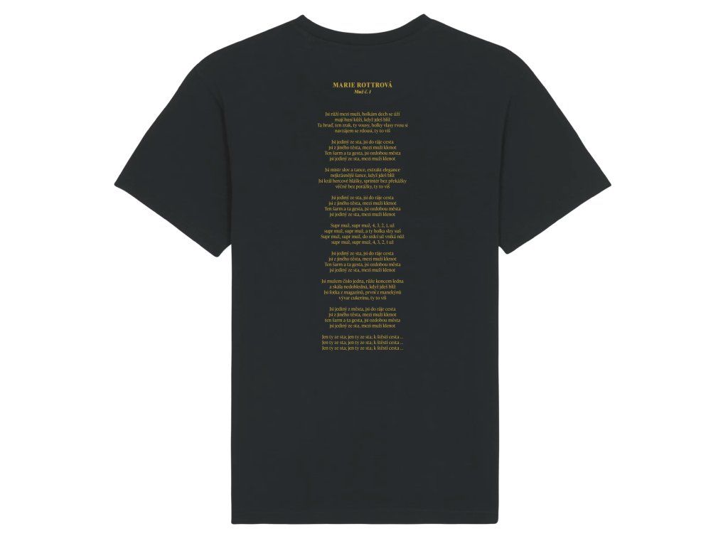 Černé triko s oboustranným potiskem ve zlaté barvě vydané jako oficiální merchandising Marie Rottrové k aktuálnímu koncertnímu turné.